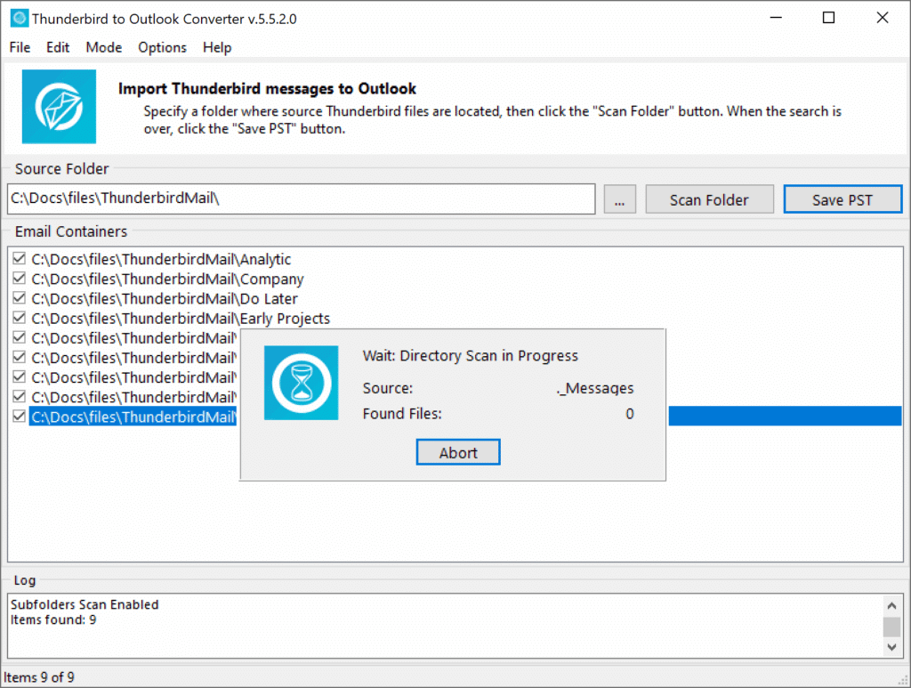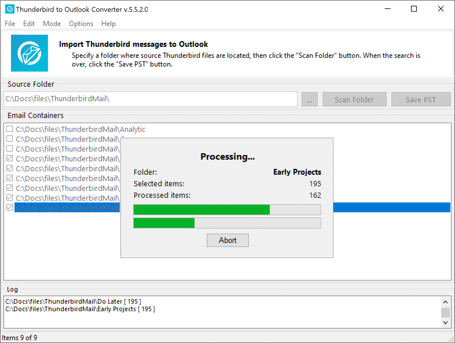 Finally, click the Import or Save button, depending on your selected mode, and the software will begin converting your Thunderbird mailboxes to Outlook format. The free trial version allows you to test the conversion process with a limited number of emails.