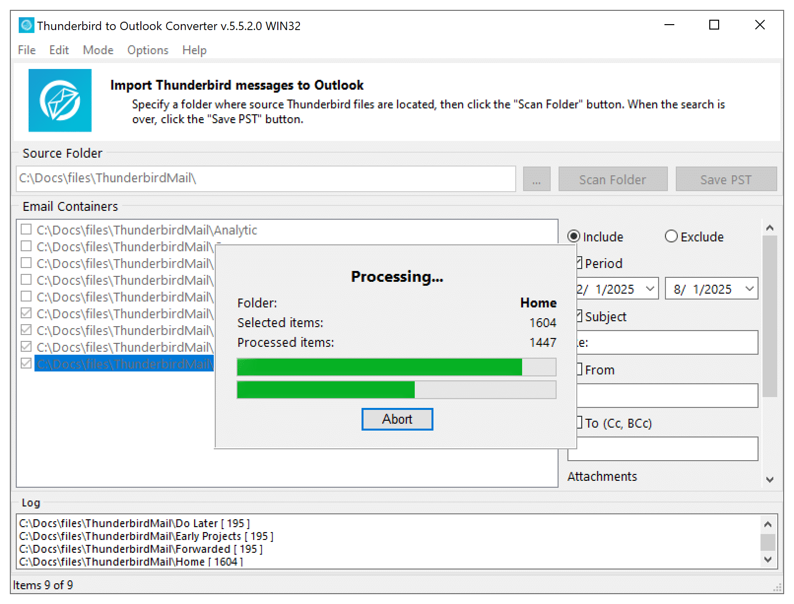 Thunderbird 到 Outlook 轉換器完全不需要額外的工具和中間步驟, 就像競爭解決方案經常出現的情況一樣. Thunderbird 到 Outlook 導出的過程顯示在程序窗口下部的兩個進度條上, 當極大的電子郵件檔案從雷鳥轉移到Outlook時,這很方便.